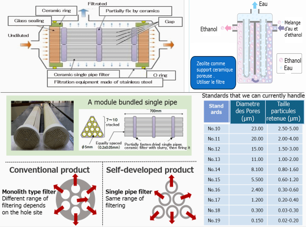Le système de filtration utilise une membrane d’ultrafiltration céramique, dont les pores ont un diamètre uniforme de 0,1 μm à 23 μm, ce qui permet une filtration efficace jusqu’au niveau submicron.